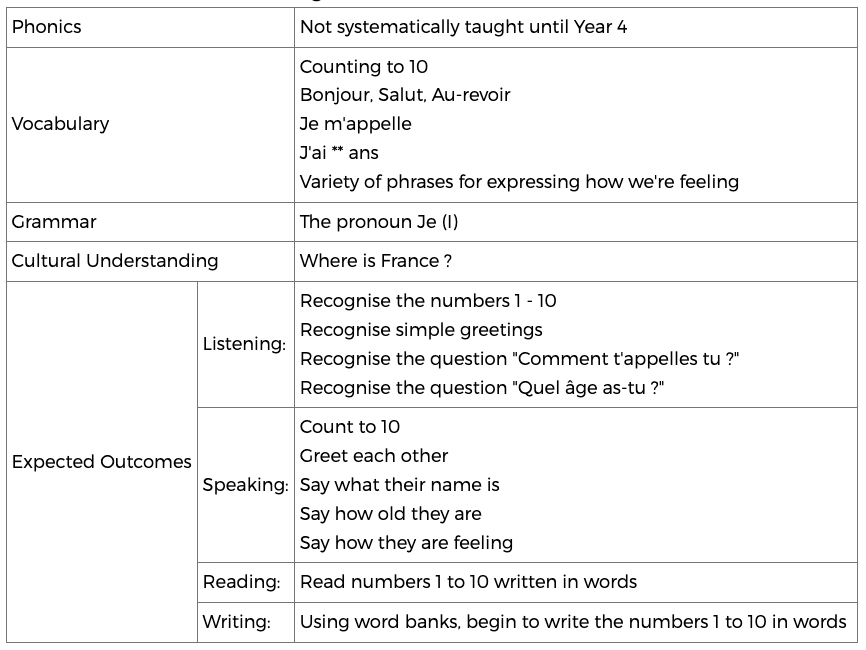 The Year 4, 5 and 6 cohorts have been taught French since Year 1 - they are still being taught our old curriculum. We gradually introduce and publish our new curriculum over the next four years following this schedule.