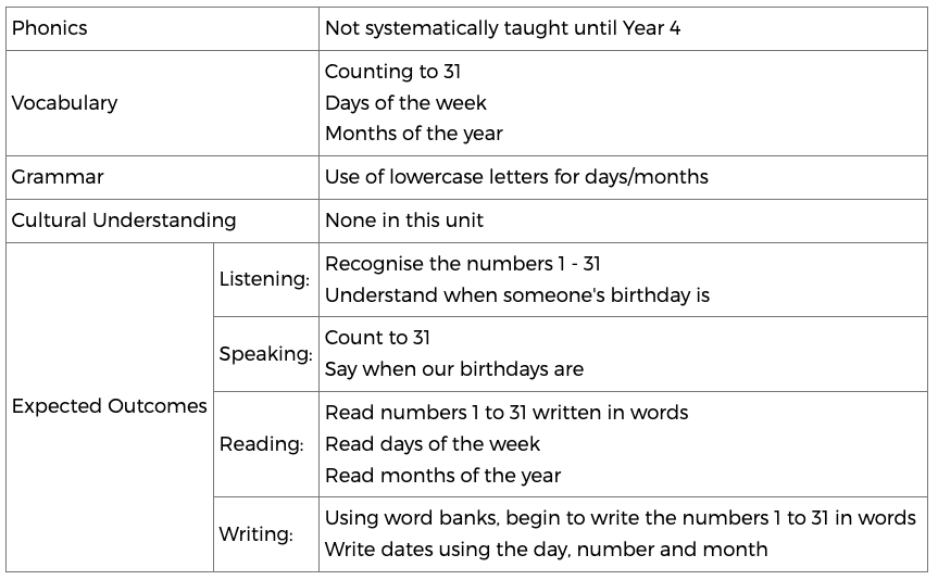 Recognise the numbers 1 - 30 Identify the names of classroom objects Identify the colour of the objects Recognise the numbers 1 - 31 Understand when someone's birthday is |