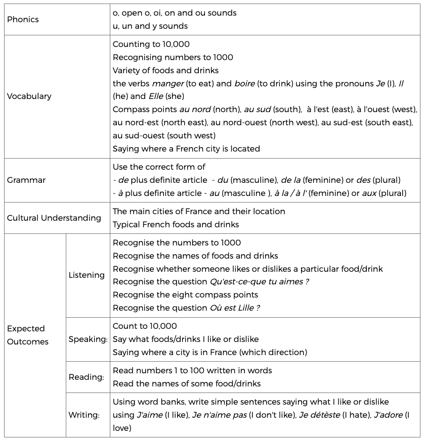Recognise the numbers to 1000 Recognise the names of foods and drinks Recognise whether someone likes or dislikes a particular food/drink Recognise the question Qu'est-ce-que tu aimes ? Recognise the eight compass points Recognise the question Où est Lille ? |