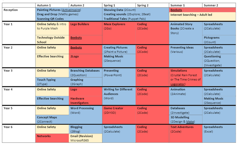 Year 5 | Children understand the value of computer networks but are also aware of the main dangers. They recognise what personal information is and can explain how this can be kept safe. Children can select the most appropriate form of online communications contingent on audience and digital content, e.g. 2Blog, 2Email, Display Boards. |